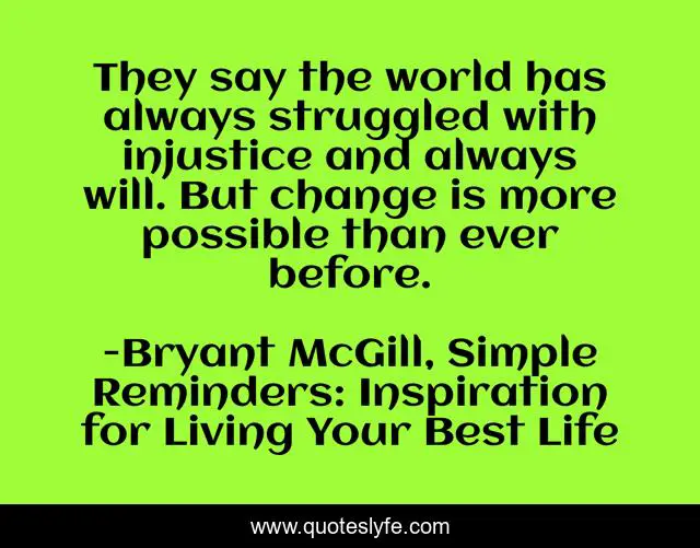 This page presents the quote "They say the world has always struggled with injustice and always will. But change is more possible than ever before.". Author of this quote is Bryant McGill, Simple Reminders: Inspiration for Living Your Best Life. This quote is about change, struggling, injustice, possibility,.