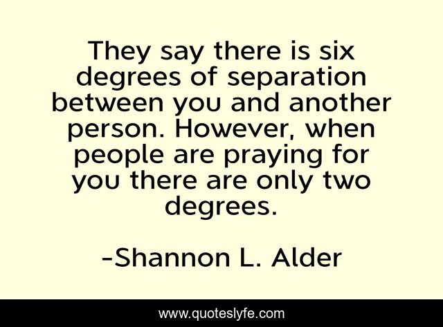 This page presents the quote "They say there is six degrees of separation between you and another person. However, when people are praying for you there are only two degrees.". Author of this quote is Shannon L. Alder. This quote is about prayer-line, god, prayer, no-coincidence, holy-ghost, christianity, blessings, six-degrees-of-separation, signs,.