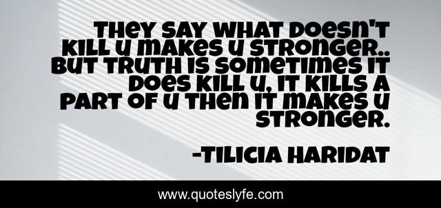 This page presents the quote "They say what doesn't kill u makes u stronger.. but truth is sometimes it does kill u, it kills a part of u then it makes u stronger.". Author of this quote is Tilicia Haridat. This quote is about strength, truth, lost-love, getting-better, reality, inspirational, enthusiasm, moving-on,.