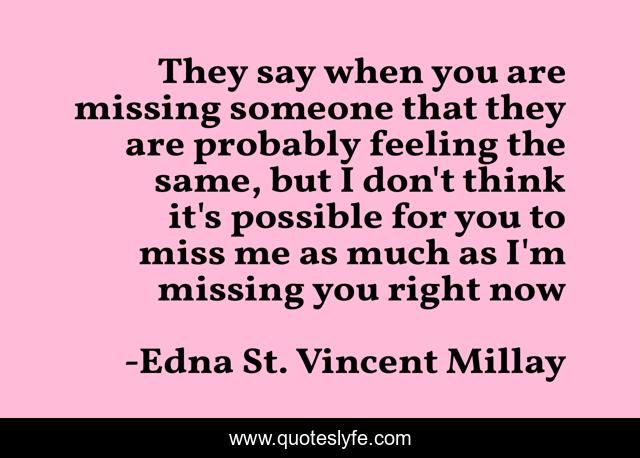 This page presents the quote "They say when you are missing someone that they are probably feeling the same, but I don't think it's possible for you to miss me as much as I'm missing you right now". Author of this quote is Edna St. Vincent Millay. This quote is about longing, sadness, love, affection, missing,.