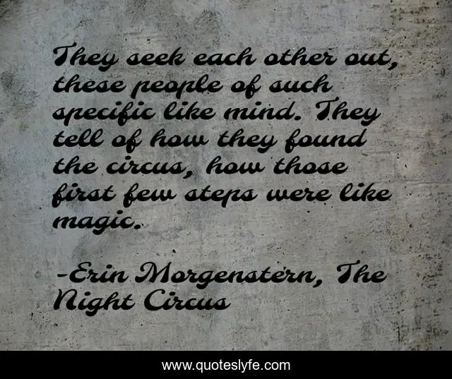 This page presents the quote "They seek each other out, these people of such specific like mind. They tell of how they found the circus, how those first few steps were like magic.". Author of this quote is Erin Morgenstern, The Night Circus. This quote is about connection, friends, unspoken-bond,.