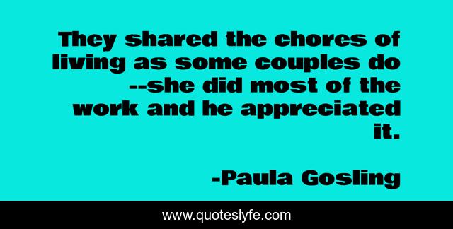 This page presents the quote "They shared the chores of living as some couples do --she did most of the work and he appreciated it.". Author of this quote is Paula Gosling. .
