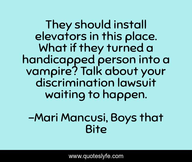 This page presents the quote "They should install elevators in this place. What if they turned a handicapped person into a vampire? Talk about your discrimination lawsuit waiting to happen.". Author of this quote is Mari Mancusi, Boys that Bite. This quote is about ya, vampire-romance-series, paranormal-romance,.