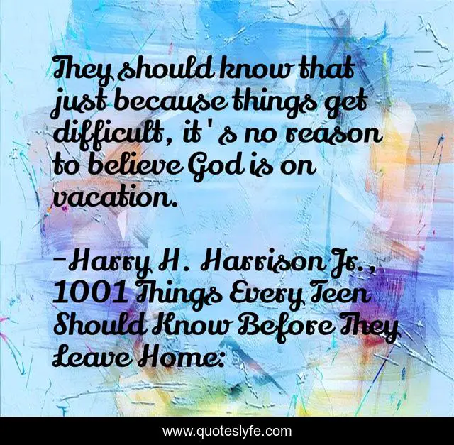 This page presents the quote "They should know that just because things get difficult, it's no reason to believe God is on vacation.". Author of this quote is Harry H. Harrison Jr., 1001 Things Every Teen Should Know Before They Leave Home:. This quote is about god, inspirational, truth, enthusiasm,.