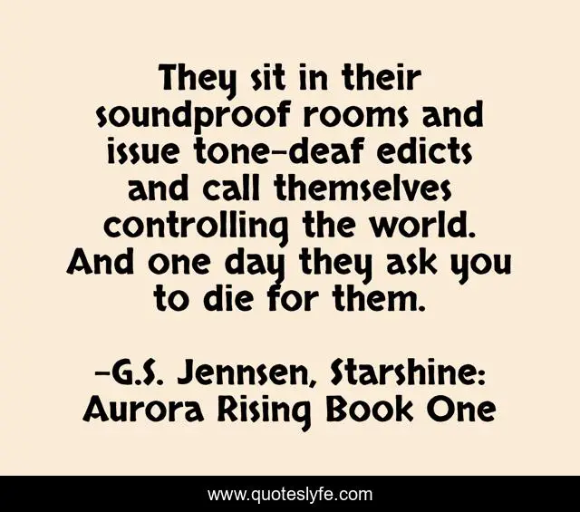 This page presents the quote "They sit in their soundproof rooms and issue tone-deaf edicts and call themselves controlling the world. And one day they ask you to die for them.". Author of this quote is G.S. Jennsen, Starshine: Aurora Rising Book One. This quote is about alex-solovy, space-opera, science-fiction, adventure, science-fiction-romance,.