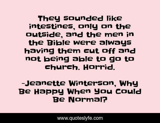 This page presents the quote "They sounded like intestines, only on the outside, and the men in the Bible were always having them cut off and not being able to go to church. Horrid.". Author of this quote is Jeanette Winterson, Why Be Happy When You Could Be Normal?. This quote is about men, humor,.