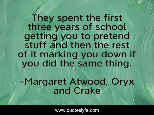 This page presents the quote "They spent the first three years of school getting you to pretend stuff and then the rest of it marking you down if you did the same thing.". Author of this quote is Margaret Atwood, Oryx and Crake. This quote is about imagination, school, pretend, growing-up,.