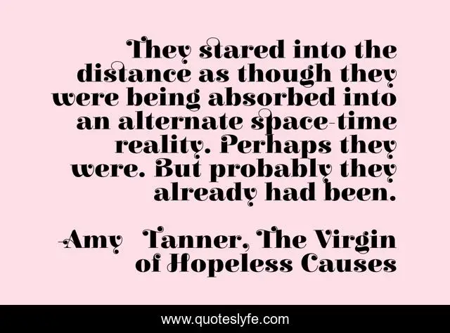 This page presents the quote "They stared into the distance as though they were being absorbed into an alternate space-time reality. Perhaps they were. But probably they already had been.". Author of this quote is Amy Tanner, The Virgin of Hopeless Causes. This quote is about fantasy, fiction, serio-comic, cross-genre,.
