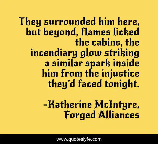 This page presents the quote "They surrounded him here, but beyond, flames licked the cabins, the incendiary glow striking a similar spark inside him from the injustice they’d faced tonight.". Author of this quote is Katherine McIntyre, Forged Alliances. This quote is about fire, shifter-romance, flame, injustice, shifter, spark, inspiration, glow,.
