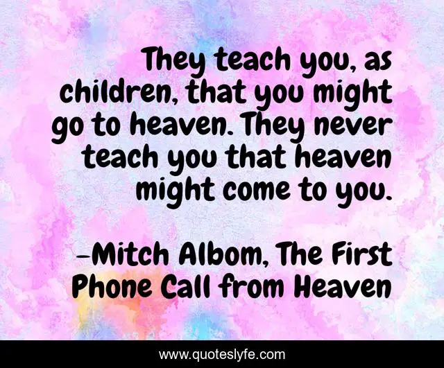This page presents the quote "They teach you, as children, that you might go to heaven. They never teach you that heaven might come to you.". Author of this quote is Mitch Albom, The First Phone Call from Heaven. This quote is about faith, heaven, inspirational, love-story, enthusiasm, hope,.