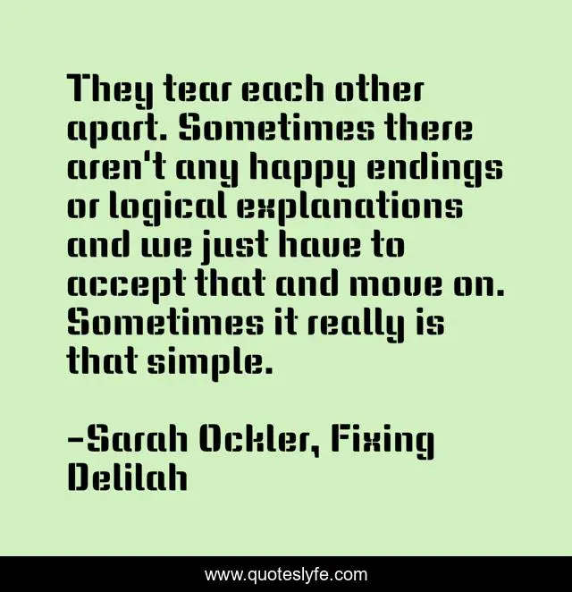 This page presents the quote "They tear each other apart. Sometimes there aren't any happy endings or logical explanations and we just have to accept that and move on. Sometimes it really is that simple.". Author of this quote is Sarah Ockler, Fixing Delilah. This quote is about love, affection, sad,.