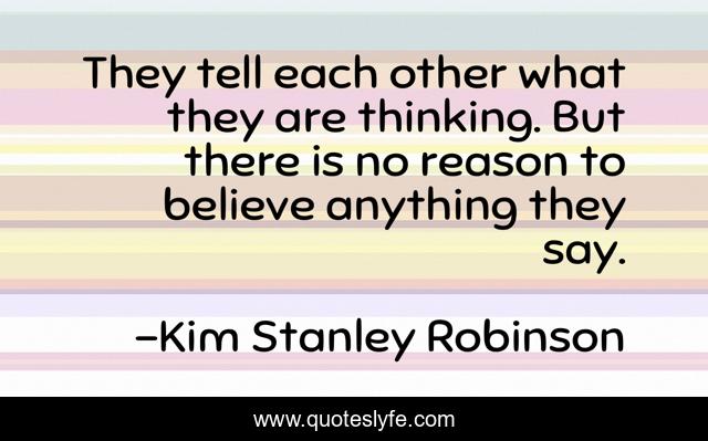 This page presents the quote "They tell each other what they are thinking. But there is no reason to believe anything they say.". Author of this quote is Kim Stanley Robinson. .