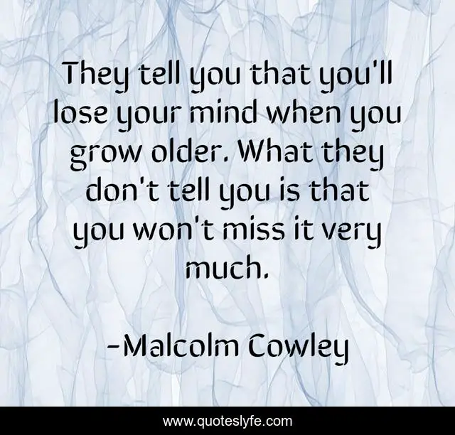 This page presents the quote "They tell you that you'll lose your mind when you grow older. What they don't tell you is that you won't miss it very much.". Author of this quote is Malcolm Cowley. This quote is about aging, age, old,.