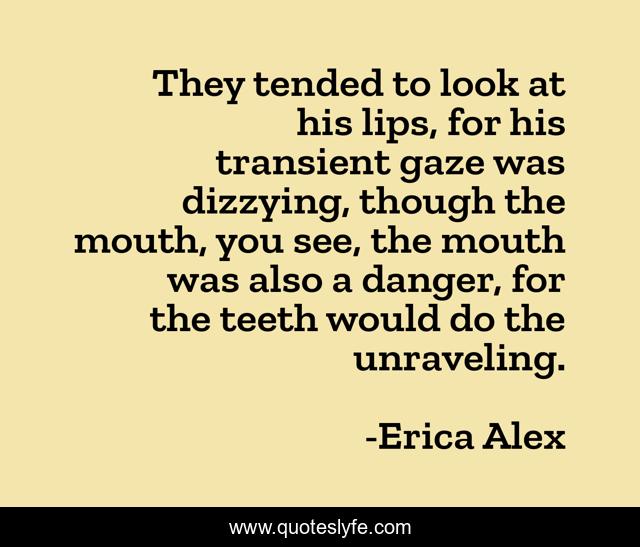 This page presents the quote "They tended to look at his lips, for his transient gaze was dizzying, though the mouth, you see, the mouth was also a danger, for the teeth would do the unraveling.". Author of this quote is Erica Alex. This quote is about romance, poem, supernatural, vampire, vampires,.