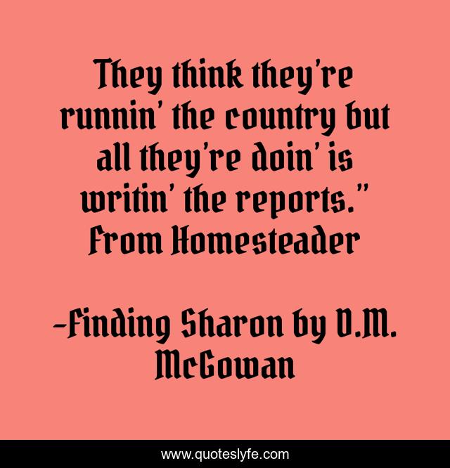 This page presents the quote "They think they’re runnin’ the country but all they’re doin’ is writin’ the reports.” From Homesteader". Author of this quote is Finding Sharon by D.M. McGowan. .