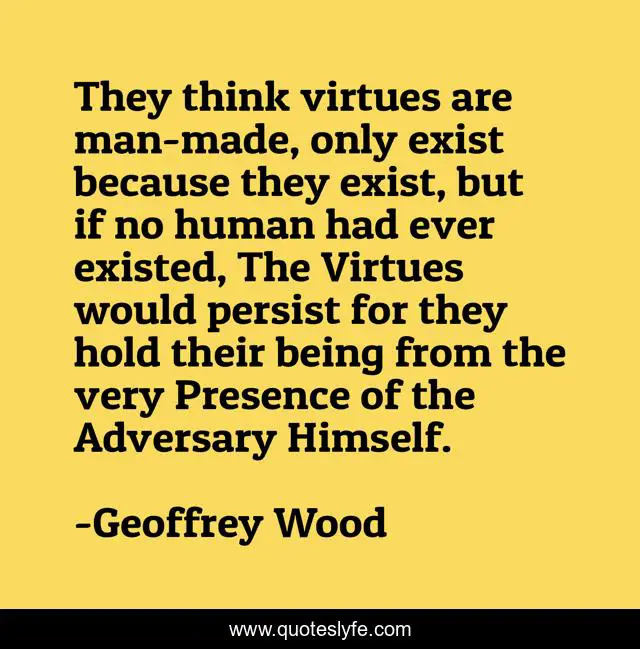 This page presents the quote "They think virtues are man-made, only exist because they exist, but if no human had ever existed, The Virtues would persist for they hold their being from the very Presence of the Adversary Himself.". Author of this quote is Geoffrey Wood. This quote is about religion, christian-fiction, grimrack, virtue, christianity,.