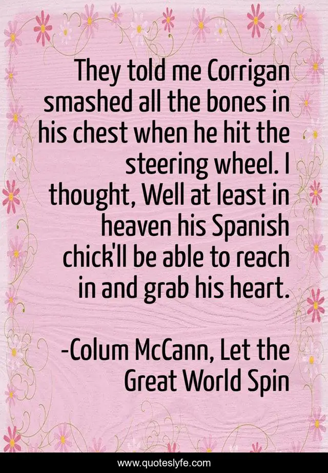 This page presents the quote "They told me Corrigan smashed all the bones in his chest when he hit the steering wheel. I thought, Well at least in heaven his Spanish chick'll be able to reach in and grab his heart.". Author of this quote is Colum McCann, Let the Great World Spin. .