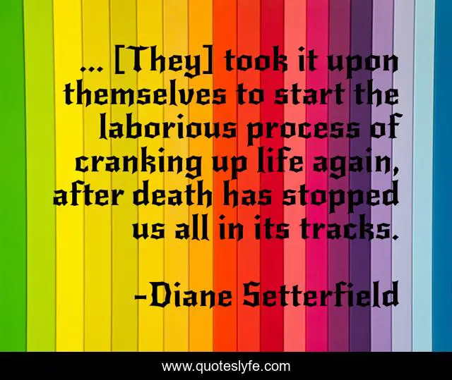 This page presents the quote "... [They] took it upon themselves to start the laborious process of cranking up life again, after death has stopped us all in its tracks.". Author of this quote is Diane Setterfield. This quote is about grief, quotes, death-and-dying,.