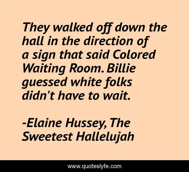 This page presents the quote "They walked off down the hall in the direction of a sign that said Colored Waiting Room. Billie guessed white folks didn't have to wait.". Author of this quote is Elaine Hussey, The Sweetest Hallelujah. This quote is about history, racism, racism-in-america,.