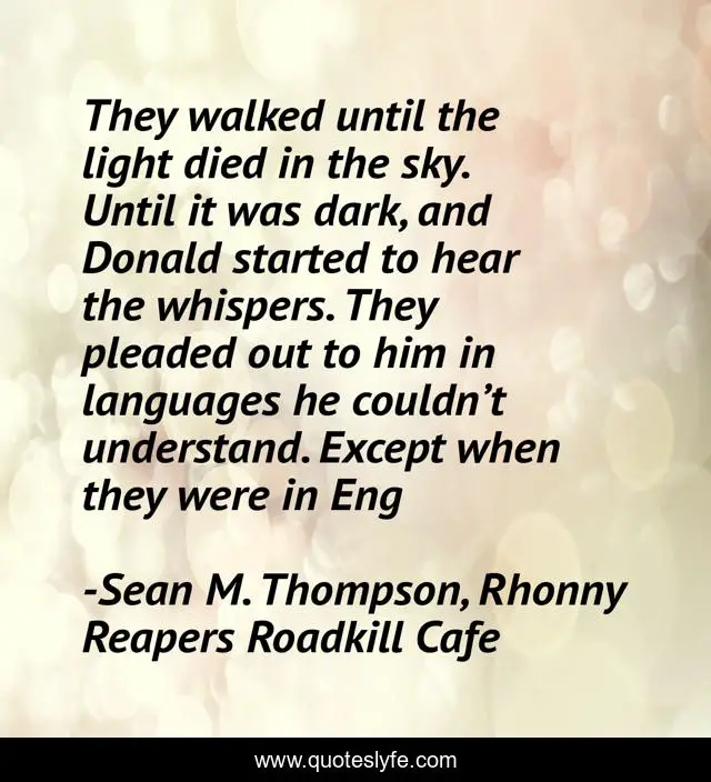 This page presents the quote "They walked until the light died in the sky. Until it was dark, and Donald started to hear the whispers. They pleaded out to him in languages he couldn’t understand. Except when they were in Eng". Author of this quote is Sean M. Thompson, Rhonny Reapers Roadkill Cafe. This quote is about horror, supernatural,.