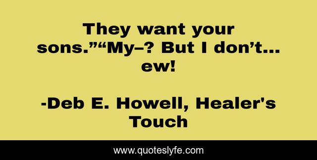 This page presents the quote "They want your sons.”“My–? But I don’t… ew!". Author of this quote is Deb E. Howell, Healer's Touch. This quote is about humorous, humor, humour,.
