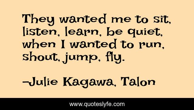 This page presents the quote "They wanted me to sit, listen, learn, be quiet, when I wanted to run, shout, jump, fly.". Author of this quote is Julie Kagawa, Talon. .
