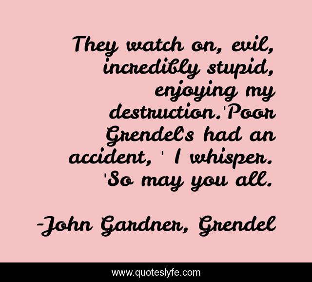 This page presents the quote "They watch on, evil, incredibly stupid, enjoying my destruction.'Poor Grendel's had an accident, ' I whisper. 'So may you all.". Author of this quote is John Gardner, Grendel. This quote is about fiction, literature, last-lines, historical-fiction, retelling,.