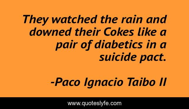 This page presents the quote "They watched the rain and downed their Cokes like a pair of diabetics in a suicide pact.". Author of this quote is Paco Ignacio Taibo II. This quote is about despair, humor,.