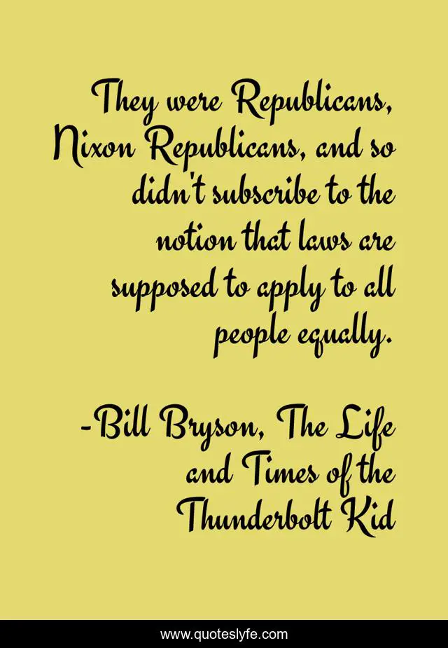 This page presents the quote "They were Republicans, Nixon Republicans, and so didn't subscribe to the notion that laws are supposed to apply to all people equally.". Author of this quote is Bill Bryson, The Life and Times of the Thunderbolt Kid. This quote is about humorous, funny, comedy, political, politics,.