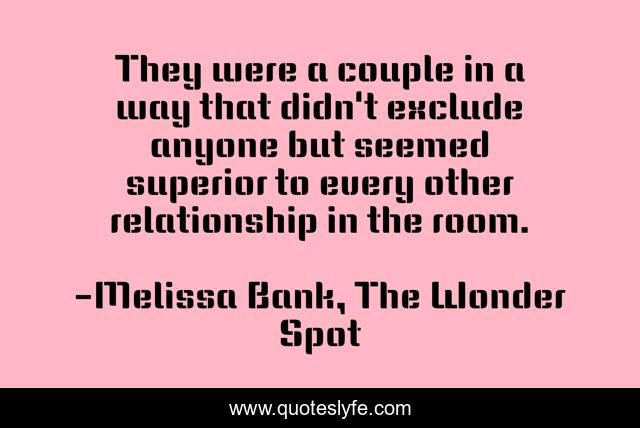 This page presents the quote "They were a couple in a way that didn't exclude anyone but seemed superior to every other relationship in the room.". Author of this quote is Melissa Bank, The Wonder Spot. .
