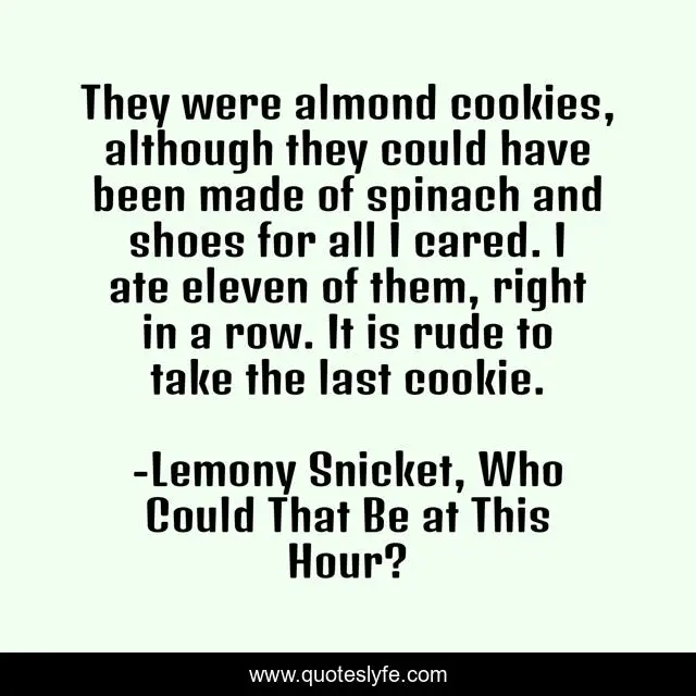 This page presents the quote "They were almond cookies, although they could have been made of spinach and shoes for all I cared. I ate eleven of them, right in a row. It is rude to take the last cookie.". Author of this quote is Lemony Snicket, Who Could That Be at This Hour?. This quote is about cookies, humor, food, manners, inspirational, enthusiasm,.
