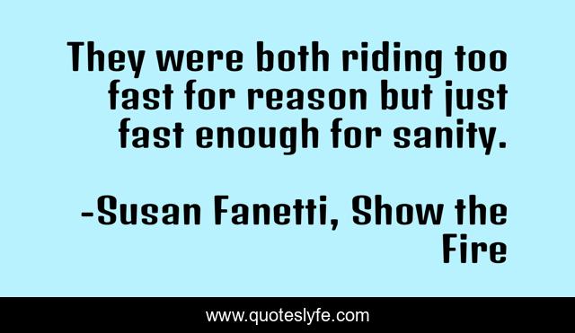 This page presents the quote "They were both riding too fast for reason but just fast enough for sanity.". Author of this quote is Susan Fanetti, Show the Fire. This quote is about live, free,.