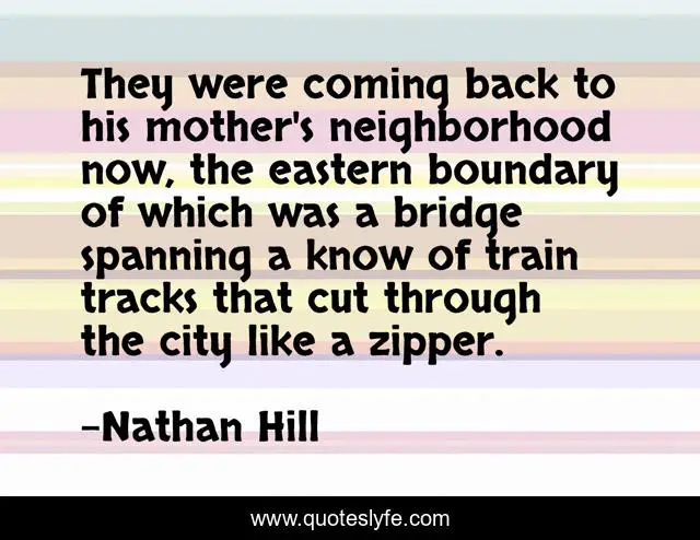 This page presents the quote "They were coming back to his mother's neighborhood now, the eastern boundary of which was a bridge spanning a know of train tracks that cut through the city like a zipper.". Author of this quote is Nathan Hill. .