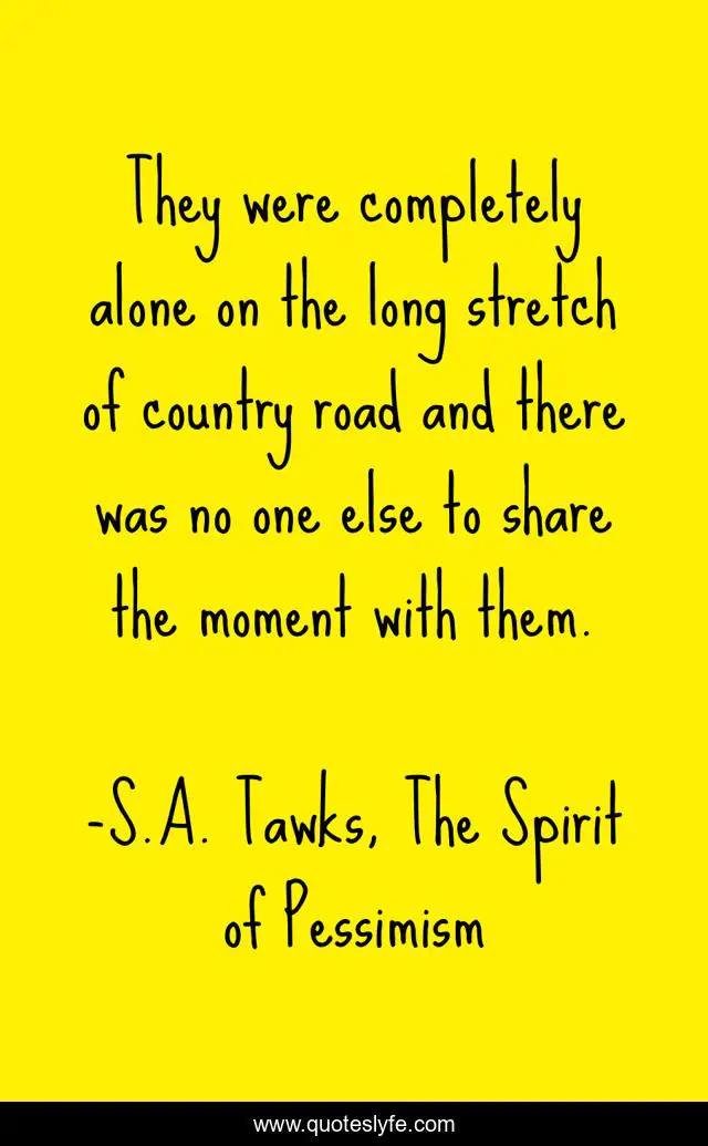 This page presents the quote "They were completely alone on the long stretch of country road and there was no one else to share the moment with them.". Author of this quote is S.A. Tawks, The Spirit of Pessimism. This quote is about author, books, reading, romantic, writing,.