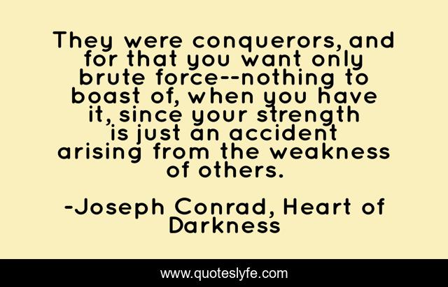 This page presents the quote "They were conquerors, and for that you want only brute force--nothing to boast of, when you have it, since your strength is just an accident arising from the weakness of others.". Author of this quote is Joseph Conrad, Heart of Darkness. .