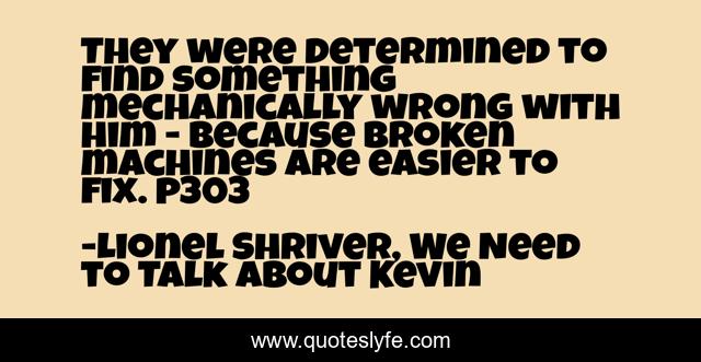 This page presents the quote "They were determined to find something mechanically wrong with him - because broken machines are easier to fix. p303". Author of this quote is Lionel Shriver, We Need to Talk About Kevin. This quote is about lionel-shriver, acceptance, we-need-to-talk-about-kevin, society-humanity, society-thinking,.