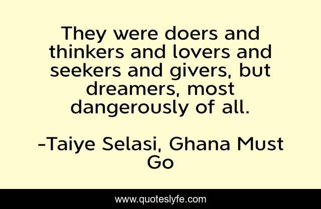 This page presents the quote "They were doers and thinkers and lovers and seekers and givers, but dreamers, most dangerously of all.". Author of this quote is Taiye Selasi, Ghana Must Go. This quote is about life, dreams, women,.
