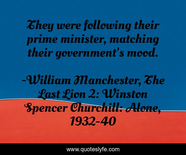 This page presents the quote "They were following their prime minister, matching their government's mood.". Author of this quote is William Manchester, The Last Lion 2: Winston Spencer Churchill: Alone, 1932-40. This quote is about leadership, attention, optimism,.