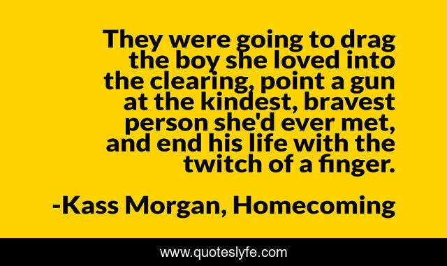 This page presents the quote "They were going to drag the boy she loved into the clearing, point a gun at the kindest, bravest person she'd ever met, and end his life with the twitch of a finger.". Author of this quote is Kass Morgan, Homecoming. This quote is about execution, love, bravery, affection,.