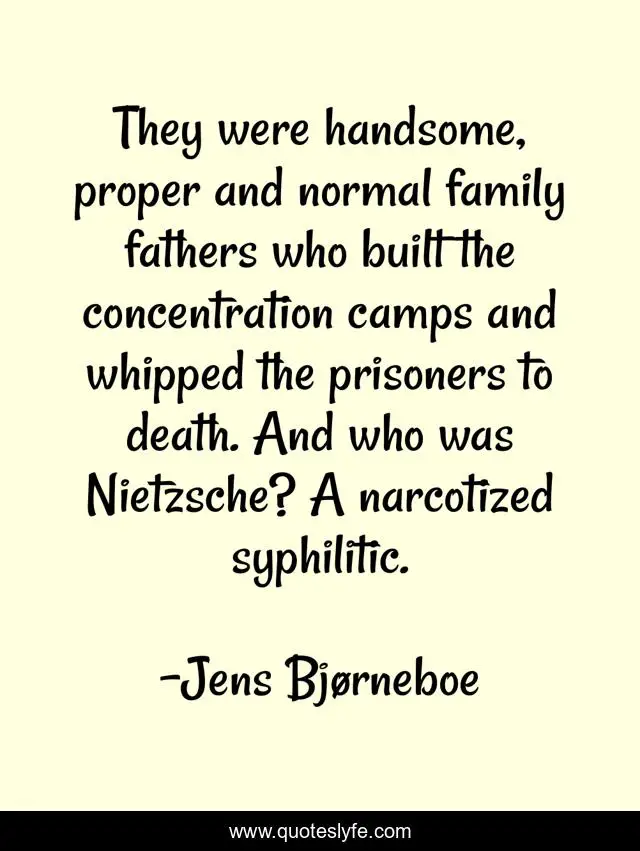 This page presents the quote "They were handsome, proper and normal family fathers who built the concentration camps and whipped the prisoners to death. And who was Nietzsche? A narcotized syphilitic.". Author of this quote is Jens Bjørneboe. This quote is about nietzsche, injustice, evil,.
