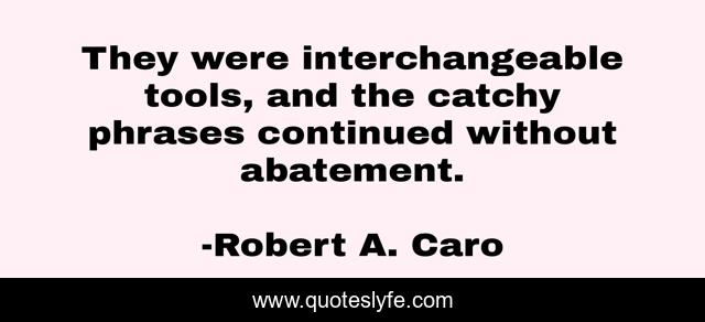 This page presents the quote "They were interchangeable tools, and the catchy phrases continued without abatement.". Author of this quote is Robert A. Caro. This quote is about media, rhetoric, persuasion,.
