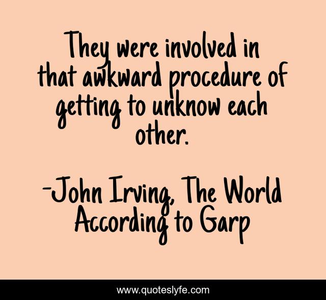 This page presents the quote "They were involved in that awkward procedure of getting to unknow each other.". Author of this quote is John Irving, The World According to Garp. This quote is about awkard, leaving, regret, final,.
