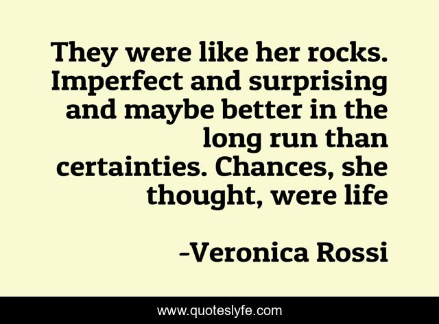 This page presents the quote "They were like her rocks. Imperfect and surprising and maybe better in the long run than certainties. Chances, she thought, were life". Author of this quote is Veronica Rossi. This quote is about dystopian-fiction, paranormal, dystopian,.