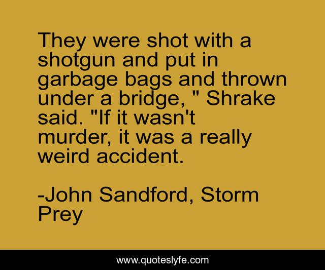 This page presents the quote "They were shot with a shotgun and put in garbage bags and thrown under a bridge, " Shrake said. "If it wasn't murder, it was a really weird accident.". Author of this quote is John Sandford, Storm Prey. This quote is about shotgun, sarcasm, murder, accident,.