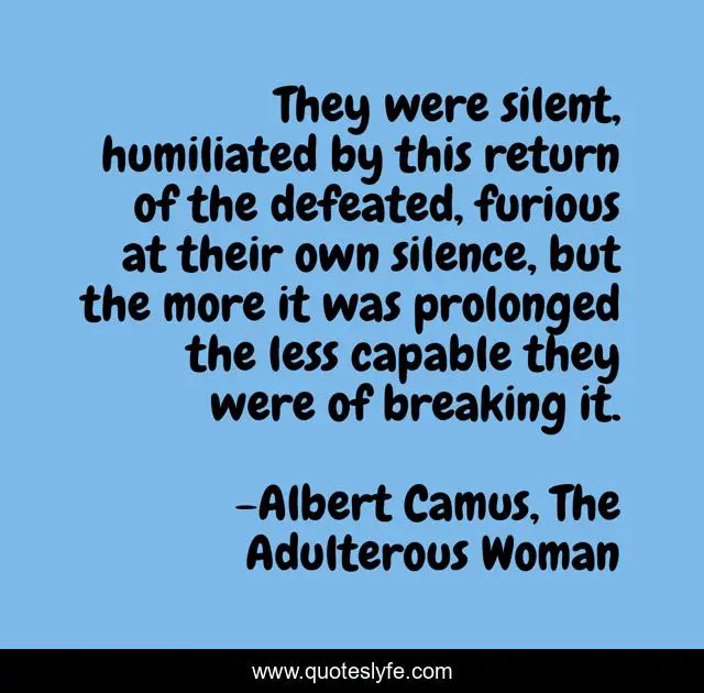 This page presents the quote "They were silent, humiliated by this return of the defeated, furious at their own silence, but the more it was prolonged the less capable they were of breaking it.". Author of this quote is Albert Camus, The Adulterous Woman. This quote is about albert-camus, camus, silence,.