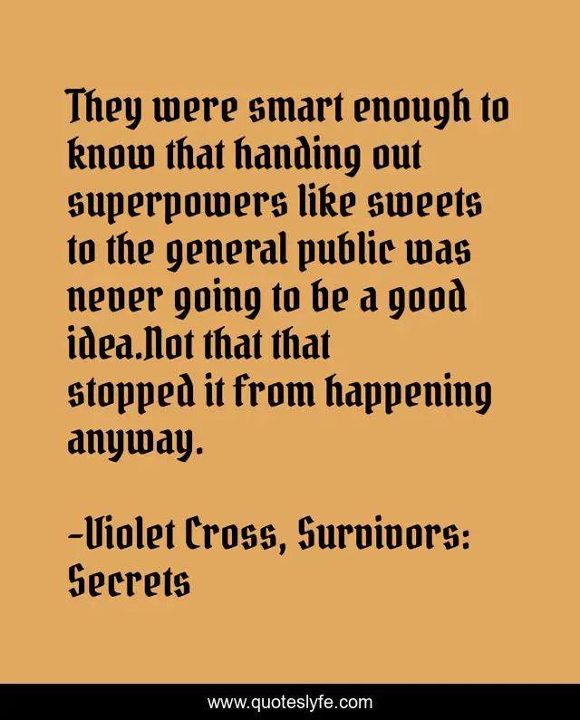 This page presents the quote "They were smart enough to know that handing out superpowers like sweets to the general public was never going to be a good idea.Not that that stopped it from happening anyway.". Author of this quote is Violet Cross, Survivors: Secrets. This quote is about secrets, survivors,.