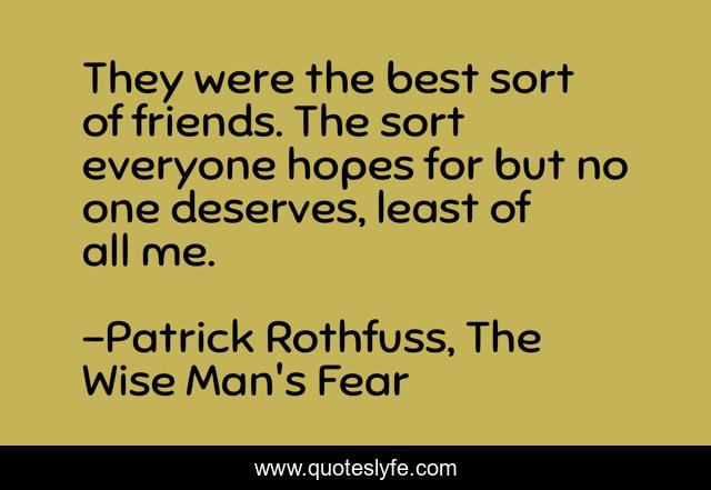 This page presents the quote "They were the best sort of friends. The sort everyone hopes for but no one deserves, least of all me.". Author of this quote is Patrick Rothfuss, The Wise Man's Fear. .