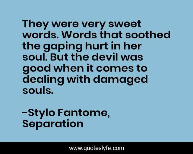 This page presents the quote "They were very sweet words. Words that soothed the gaping hurt in her soul. But the devil was good when it comes to dealing with damaged souls.". Author of this quote is Stylo Fantome, Separation. .
