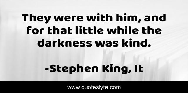 This page presents the quote "They were with him, and for that little while the darkness was kind.". Author of this quote is Stephen King, It. This quote is about kindness, darkness,.