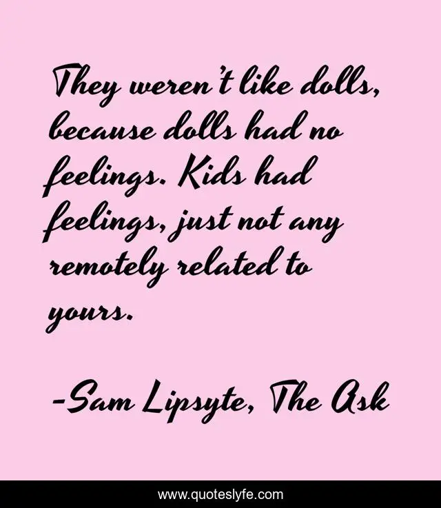 This page presents the quote "They weren’t like dolls, because dolls had no feelings. Kids had feelings, just not any remotely related to yours.". Author of this quote is Sam Lipsyte, The Ask. .